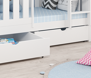 Šuplíky pod postelí (o hloubce 80 cm) na kolečkách jsou praktickým řešením na povlečení. Odporné proti zašpinění díky pevné laminované desce s bílým obložením. Umožňují chytré uspořádání dětského pokoje s dodatečným místem na povlečení, hračky nebo oblečení.